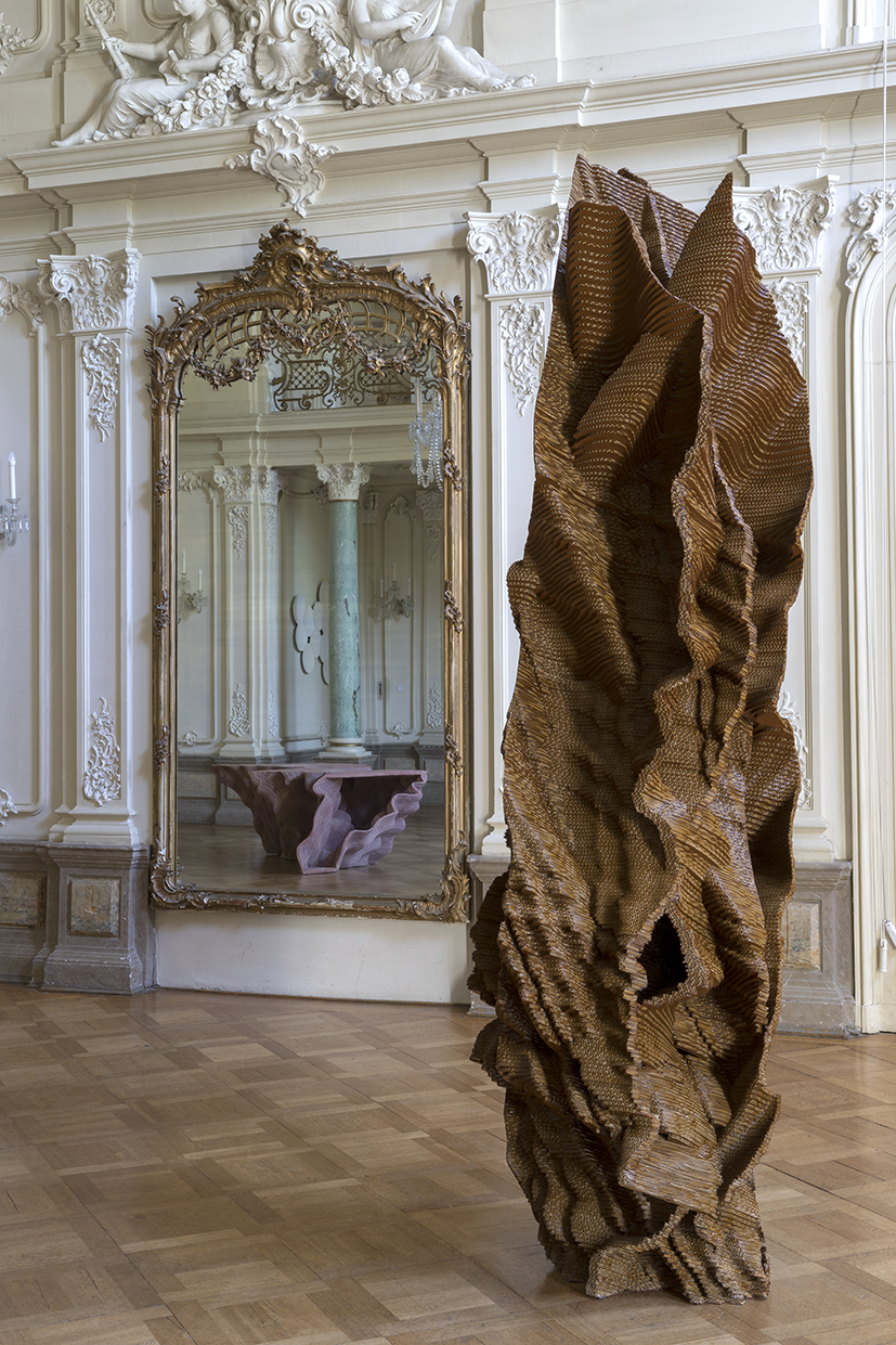 Neben ihrer starken skulpturalen Präsenz im Raum, können drei der vier Objekte je nach Anlass auch als Möbel benutzt werden: als Trautisch an dem sich Brautpaare das Ja-Wort geben, als Rednerpult und als Diskussionstisch für Reden und Widerreden. Allein eines der vier Elemente fungiert als rein skulpturale Setzung, die dem historischen Ambiente des Spiegelsaals eine aktuelle Mehrstimmigkeit entgegensetzt – eine Mehrstimmigkeit, die dazu einlädt, die eigene Stimme zu erheben, genau hinzuhören, präzise hinzusehen und sich gemeinsam an einen Tisch zu setzen.